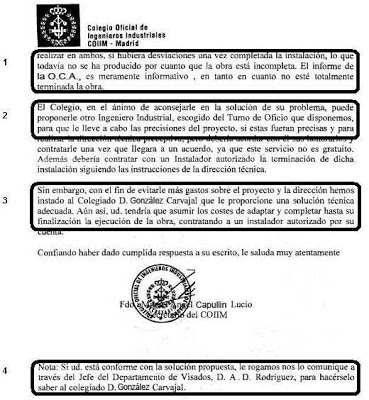 El ciudadano protestó, y la respuesta del Colegio Oficial de Ingenieros Industriales de Madrid fue, vulgarmente hablando, la de seguir encubriendo la estafa de ese Ingeniero tan pobre y tan honrado. Se remitían a que "ya que habían tomado la decisión de prevaricar y encubrir la estafa, además de no asumir económicamente el visado ilegal, engañando al ciudadano para que prosiguiera haciendo disposiciones económicas en una instalación ilegal", y aseguraron que el proceder de esa institución era correcto porque nadie reclamaba, ya que ellos eran los Dioses del Visado. Y se le respondió con esta carta: