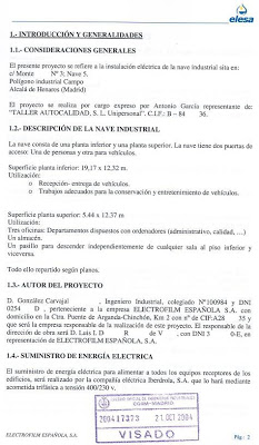 -Ilustres Señorías de la Junta Extraordinaria del Colegio Oficial de Ingenieros Industriales de Madrid. Solo con enseñarles la primera hoja del proyecto, se darán cuenta de lo que este Estafador de Ingeniero Industrial Colegiado ha realizado. Ha estafado a un ciudadano ocultando cualquier tipo de consideración de que el proyecto industrial con número de visado 200417373 es para la instalación eléctrica de un taller de chapa y pintura, y lo ha puesto con el epígrafe, en su primera página, de "proyecto técnico correspondiente a la instalación eléctrica de una nave industrial", en vez de "un taller de chapa y pintura". Esta prueba lo dice todo. Nos coló en nuestro Departamento de Visados un proyecto estafa para que lo visáramos y el Ingeniero Remero Visador no se fijó en nada. Y le puso los sellos del Visado Colegial que acreditan que hemos contemplado la normativa aplicable en ese proyecto.