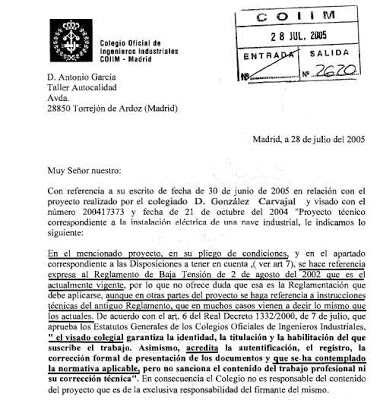 Nota del autor: Las dos cartas publicadas como contestación del COIIM son reales, así como los proyectos. Se ha modificado el nombre: del proyectista y su número de colegiación, del Responsable del Departamento de Visados, del Director y del ex-Secretario. También se ha ocultado el nombre del Organismo de Control Autorizado, al cual se le ha puesto las siglas O.C.A. El sello del Colegio Oficial de Ingenieros Industriales de Madrid solo se ha desplazado para que entrara correctamente. El resto, y aunque parezca mentira lo que la picha estira, es la respuesta real, sin modificación alguna, a un proyecto estafa ilegal, legalizado mediante el visado ilegal del Colegio Oficial de Ingenieros Industriales de Madrid, el COIIM.