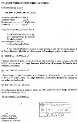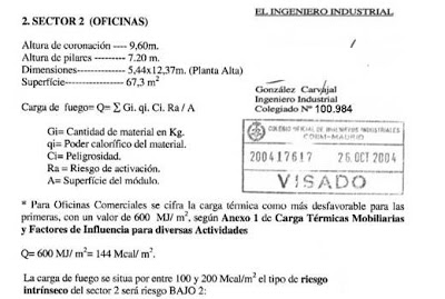-Y considerando que las oficinas tienen un riesgo mayor que el de la zona de taller. Finalizando ya con un gesto de rabia, vuelve a mostrar la hoja del proyecto 200417617, mostrando que las oficinas tienen más carga de fuego y un riesgo intrínseco mayor que la zona de reparación de un taller de chapa y pintura, en el cual existen gases explosivos y sustancias inflamables e ignífugas que no han sido consideradas por el Ingeniero Estafador González Carvajal.