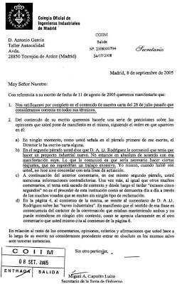 -¡Jodeos, Cabrones de mierda hijos de puta del COIIM, mierda de Mafia del Colegio Oficial de Ingenieros Industriales de Madrid, que cobráis una pasta gansa, Hijos de Puta, por poner un puto sello de mierda de visado, para alimentar a tanto miserable estómago desagradecido y tanto perro vago de la Junta de Gobierno del COIIM!, mientras los Ingenieros nos lo curramos y nos partimos el culo como unos miserables negracos. ¡Jodeos, hijos de puta del COIIM, que vosotros fuisteis los responsables de visar ilegalmente mis proyectos estafa, y ahora con esta carta prevaricativa y cómplice de mis delitos, vais a encubrir mi estafa, pardillos capullos cabrones del COIIM, que os tengo agarrados de los mismísimos huevos "ad eternum y por los siglus de los siglus, amén". No podréis denunciarme y yo, por supuesto, me seguiré partiendo el nacle de tanto reir, Hijos de Puta.